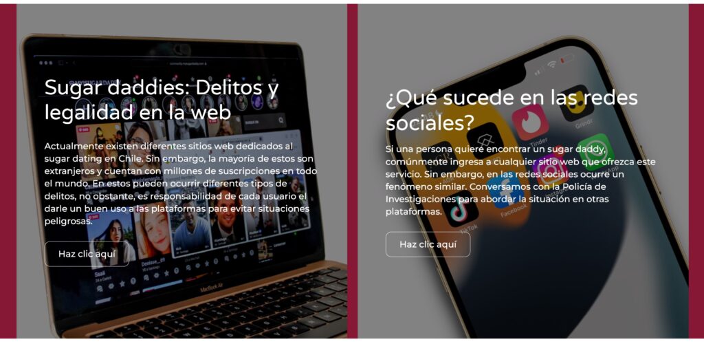 En el reportaje se realizó una entrevista a una mujer de 25 años que actualmente tiene una relación con seis hombres de los que obtiene una compensación económica. Además, se dieron a conocer los peligros que pueden tener estos encuentros si no se toman los resguardos necesarios. Actualmente en internet se pueden encontrar distintas plataformas donde, con el simple paso de crearse una cuenta, se puede entrar en este mundo popular, pero a la vez, peligroso.